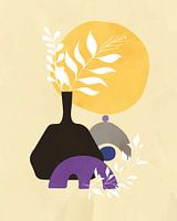 Minimalistisch stilleven met takjes in een vaas, omgeven van organische vormen en nog een takje. De kleuren - wit, geel, blauw, paars en grijs - staan voor een zonnige dag in de lente.