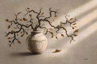 Kunstwerk in beige en warme herfst tinten, een vaas met takken met bruine blaadjes eraan. Schilderij met veel warme kleuren en textuur. Past goed in een landelijk interieur