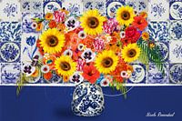 Mooi boeket met zonnebloemen en andere vrolijke bloemen in de delfst blauwe vaas. Dit echte Hollandse schilderij is gemaakt van olieverf en digitaal verwerkt.