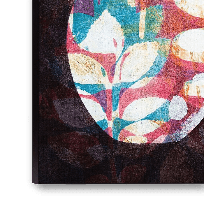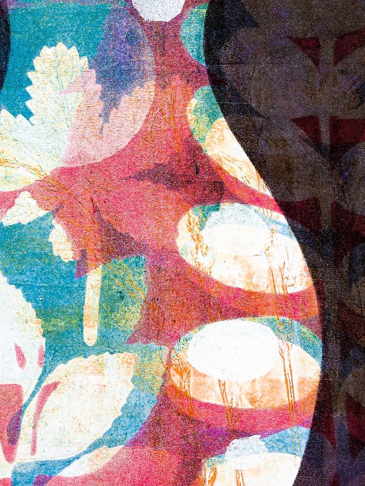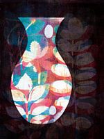 Deze botanische monotype of monoprint is gemaakt met een gelliplate en acrylverf. Een uniek handgemaakt en eenmalig werk, er kan maar 1 afdruk worden gemaakt van je ontwerp. Door de grafische druktechniek en het gebruikte papier ontstaan er allerlei structuren en effecten. Bij dit werk heb ik bloemetjes, planten, bladeren en grassen geplukt en deze in de verf gedrukt. Door meerdere keren over elkaar te drukken en met gebruik van een sjabloon van een vaas ontstaat dit unieke werk. Doordat er wit is uitgespaard houdt het werk zijn frisheid. In de zwarte achtergrond zijn nog de bladeren te zien. Dit maakt de achtergrond minstens zo interessant om te zien.