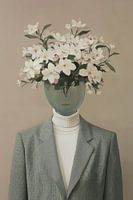 Subtiele en poëtische benadering van identiteit en natuur. Centraal staat een figuur in een sobere, grijsgroene blazer met een witte coltrui, een klassieke en zakelijke outfit die contrasteert met het surrealistische element: het hoofd is vervangen door een glazen vaas waarin een boeket witte bloemen bloeit. De bloemen lijken op jasmijn…