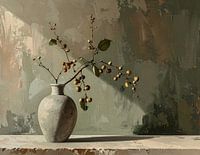 Een betonnen vaas met een grillige tak met droge appels eraan. Een werk in groen en grijs met rijke textuur.