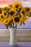 Deze betoverende beeldmanipulatie toont een vaas vol zonnebloemen die naadloos overloopt in een uitgestrekt zonnebloemenveld. Het geheel is gehuld in de warme gloed van een ondergaande zon, die een sfeervolle en kleurrijke ambiance creëert. De levendige kleuren van de zonnebloemen worden prachtig versterkt door het zachte, gouden licht van de zon, wat een harmonieus en visueel aantrekkelijk tafereel oplevert.