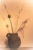 Stilleven van een uniek vaasje, gemaakt uit papier-maché, met gedroogde bloemen. De foto heeft een lichte en zonnige sfeer.