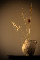 Stilleven van een uniek vaasje, gemaakt uit papier-maché, met gedroogde bloemen. De foto heeft een donkere en moody sfeer.