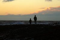 Vader aan zoon bij Westkapelle, Zeeland, Nederland. Het was op het einde van een mooie en stormachtige herfstdag toen ik deze vader met zijn zoon spotte. Ze stonden samen aan de waterkant en keken naar de woest zee. De zon was al onder gegaan en het was aan het einde van de dag. Mooie kleuren zichtbaar in de lucht en vader en zoon mooi als silhouettes.