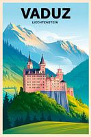Kasteel Vaduz troont majestueus op zijn steile helling, omringd door glooiende heuvels en dramatische bergtoppen. De delicate pastelkleuren geven het gebouw een dromerig karakter, terwijl de torenhoge kantelen de blik in de verte trekken. Deze harmonieuze combinatie van architectuur en natuur nodigt uit tot verwonderen en ontdekken.