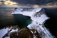 Bergkam van het eiland Vaeroy in de besneeuwde winter bij zonsondergang, Lofoten