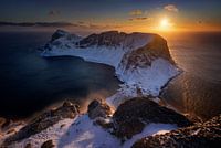 Bergkam van het eiland Vaeroy in de besneeuwde winter bij zonsondergang, Lofoten