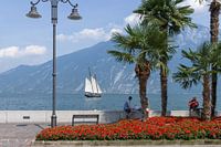 Uitzicht op het Gardameer vanaf Limone sul Garda. Een oude zeilboot vaart op het Gardameer met de uitlopers van de Alpen op de achtergrond. Toeristen zitten te genieten van hun Italiaanse ijsje en genieten van het uitzicht.