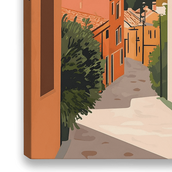 In dit kunstwerk wordt een kleurrijk straatje tot leven gebracht in een mix van warme en kleurrijke kleuren en tinten, die prachtig samensmelten en een zomerse sfeer oproepen.
