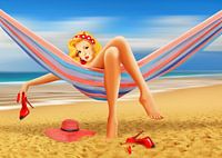 Pin-up girl in een hangmat op zonnige strand bij de zee.