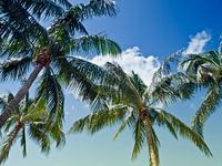 Palmbomen voor een prachtige blauwe lucht. Zomer, vakantie en mooi weer. Breng het palmparadijs naar huis!