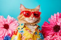 Een stralende kater met een kleurrijk Hawaï-shirt en een opvallende rode zonnebril zorgt voor een goed humeur en vakantiesfeer. Omringd door grote, fleurige bloemen straalt hij levensvreugde uit. Dit charmante kunstwerk voegt een vrolijke, ontspannen sfeer toe aan elke woonkamer en is een echte blikvanger!