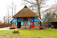 Een huisje in de Achterhoek, vakwerk met blauwe muren en rode deuren.