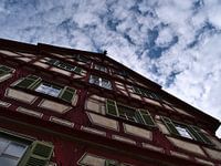 Gezicht van onderen op de kleurrijke voorgevel van een oud vakwerkhuis in de oude stad Esslingen am Neckar, Baden-Württemberg, Duitsland met wit en rood schilderwerk en groene luiken onder een licht bewolkte hemel.