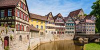 Historische vakwerkhuizen aan de rivier de Kocher in de oude stad Schwäbisch Hall in Baden-Württemberg, Duitsland