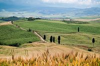 Een graanveld op de voorgrond, en een slingerweggetje met de typerende cipressen, dat naar het huis op de heuvel leidt.