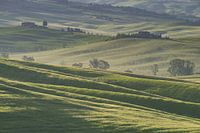 Landschap bij zonsopgang rond Pienza, Val d'Orcia, Orcia-vallei, UNESCO-werelderfgoed, provincie Siena, Toscane, Italië, Europa
