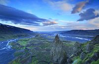 De zon komt bijna op tijdens een bewolkte ochtend in zuidelijk IJsland. Blue hour gezien vanaf de puntige topjes van de berg Valahnùkur in Pórsmörk. Hier loopt de beroemde Laugavegur wandelroute, die Pórsmörk met het populaire Landmannalaugar verbind.