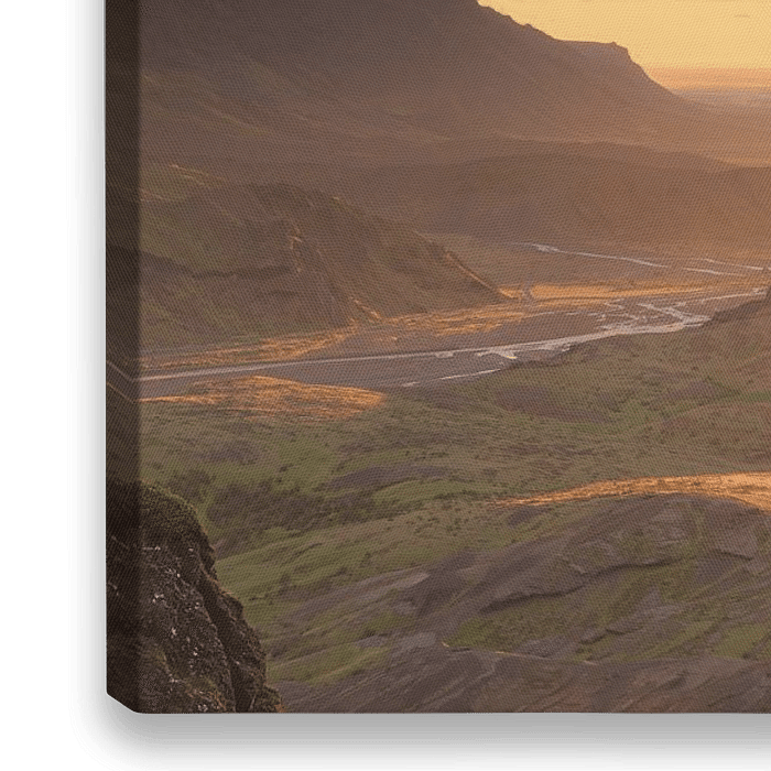 De zon gaat bijna onder op een bewolkte avond in zuidelijk IJsland. Gezien vanaf de bergtop Valahnùkur in Pórsmörk. Hier loopt de beroemde Laugavegur wandelroute, die Pórsmörk met het populaire Landmannalaugar verbind.