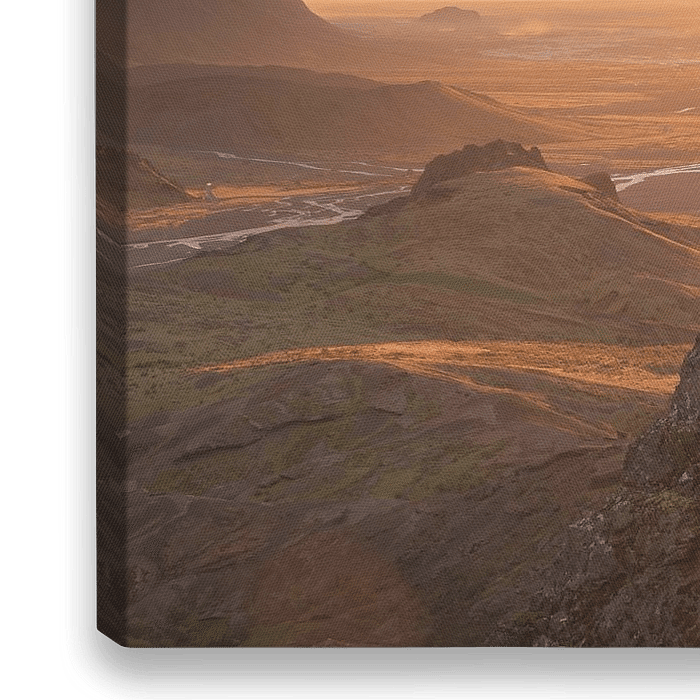 Buitensporter geniet op de bergtop Valahnùkur van een kleurrijke zonsondergang op zuidelijk IJsland. Hier nabij Pórsmörk loopt de beroemde Laugavegur wandelroute, die Pórsmörk met het populaire Landmannalaugar verbind, vlak langs.