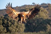 Vale Gier (Gyps fulvus) in vlucht. Landend op de grond in Spanje.