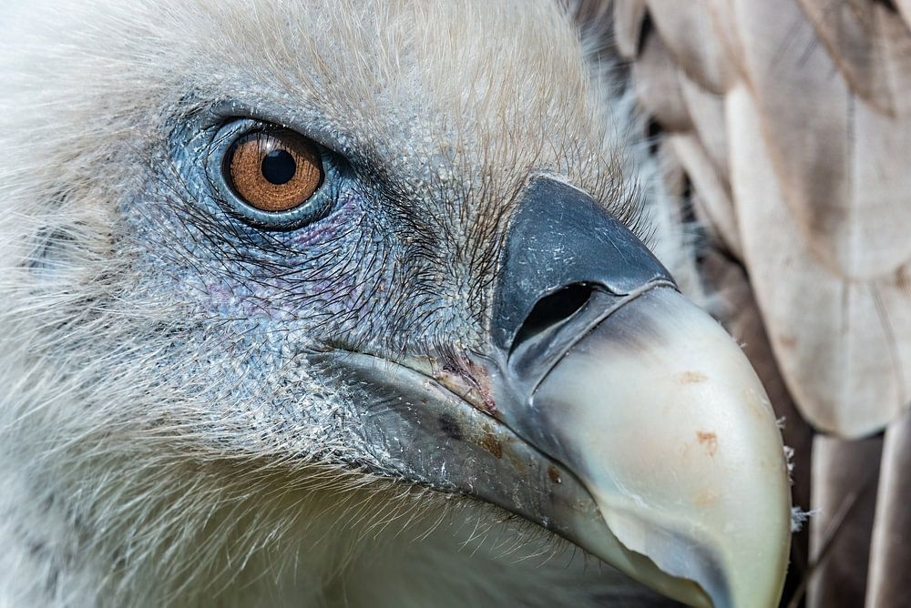Weinig veren in de nekpartij, aangezien ze tijdens het eten nogal vaak in een kadaver komen is het niet handig met veel veren.