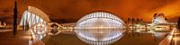 Santiago Calatrava is architect, ingenieur en kunstenaar. Door zijn technische en kunstzinnige capaciteiten omvat zijn architectuur ranke, bijna organische vormen, die vaak op het randje liggen van de technische mogelijkheden. Calatrava ontwerpt vooral grotere gebouwen (luchthavens, stations, bruggen, operahuizen, hoge torenflats) en staat in het bijzonder bekend om zijn elegante en technisch complexe bruggen. Deze foto is gemaakt in Valencia in de stad van kunst en wetenschappen. Ik was daar in de maand februari en had het geluk dat er niet veel toeristen waren. Vooral ’s avonds maakt de architectuur een enorme indruk.