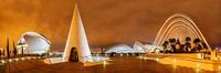 Santiago Calatrava is architect, ingenieur en kunstenaar. Door zijn technische en kunstzinnige capaciteiten omvat zijn architectuur ranke, bijna organische vormen, die vaak op het randje liggen van de technische mogelijkheden. Calatrava ontwerpt vooral grotere gebouwen (luchthavens, stations, bruggen, operahuizen, hoge torenflats) en staat in het bijzonder bekend om zijn elegante en technisch complexe bruggen. Deze foto is gemaakt in Valencia in de stad van kunst en wetenschappen. Ik was daar in de maand februari en had het geluk dat er niet veel toeristen waren. Vooral ’s avonds maakt de architectuur een enorme indruk.
