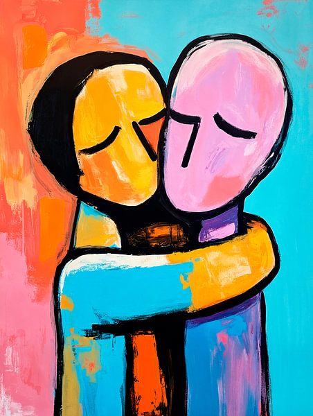 Valentijn Omhelzing - Dit figuratieve schilderij toont twee gestileerde personen die elkaar omhelzen, uitgevoerd in krachtige, expressieve kleuren en abstracte vormen.