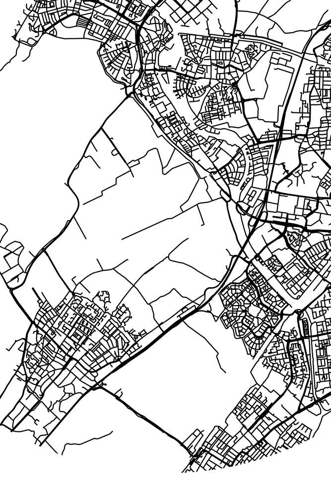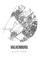 Zwart-witte landkaart, stratenplan of plattegrond van Valkenburg. Valkenburg is gelegen in de Randstad, in de gemeente Katwijk, provincie Zuid-Holland. Op de stadskaart zijn alle openbare wegen in Valkenburg opgenomen. Verder is de kaart voorzien van de coördinaten van het centrum van Valkenburg.