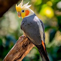 Met zijn majestueuze verenkleed en opvallende, felgele kuif straalt deze vogel charmante elegantie uit. De zachte grijze tinten van zijn vleugels contrasteren betoverend met de fel oranje accenten. Hij zit op zijn tak en straalt een gevoel van kalmte en gratie uit terwijl hij aandachtig zijn omgeving observeert.