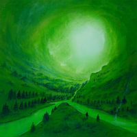 Dit schilderij toont een fascinerend tafereel waarin een groene mist het landschap in een mysterieus licht hult. De kijker kijkt in een wijde opening die wordt bedekt door een ondoordringbare deken van groene wolken. Deze mistige sluier geeft het tafereel een droomachtige kwaliteit en creëert een aura van mysterie.