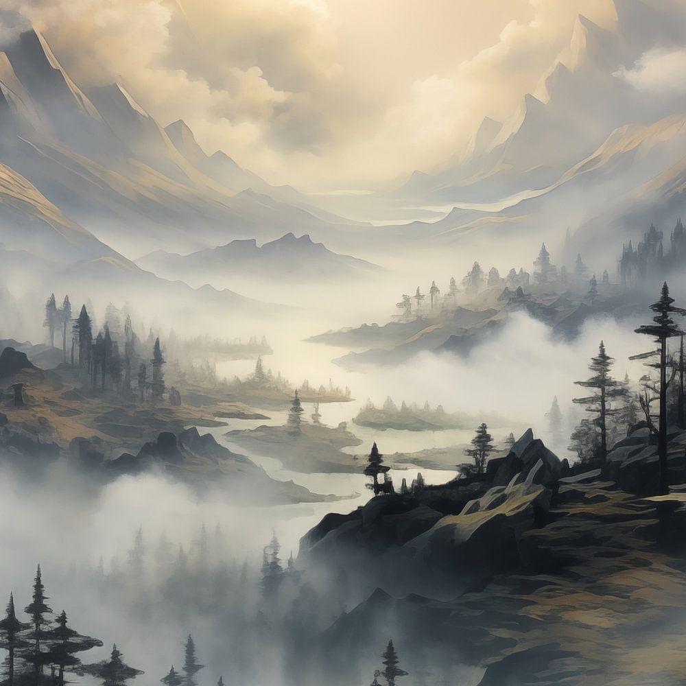 Unieke Vallei mistig schilderij met een prachtige stijl. Met prachtige kleurtinten en een uniek ontwerp maakt dit tot een stijlvolle fotoprint die prachtig staat in elke ruimte.