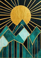 Een minimalistisch landschapschilderij in een abstracte stijl, geïnspireerd op Japanse kunst, met bergen en de zachte gloed van de zon of maan. Het combineert sereniteit en kracht.