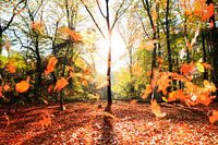 Prachtige opname van het Grebbebos op de Grebbeberg bij Wageningen en Rhenen met vallende oranje bladeren tijdens zonsopkomst in de herfst