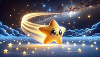 Een prachtige ster begint aan een nachtelijke reis, laat een glanzend spoor van vallende sterren achter en duikt door wolken zo zacht als watten. De kosmos op de achtergrond is versierd met de Melkweg en ontelbare sterren, waardoor een majestueuze achtergrond ontstaat. Beneden schittert de ster, bijna alsof hij het heelal verlicht met zijn vreugde. De scène is een lofzang op oneindigheid en de wonderen van de nachtelijke hemel, die dromen en fantasieën over kosmische avonturen wekt.