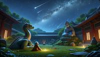 Onder een nachtelijke hemel vol vallende sterren delen een monnik en een draak een moment van stilte in de tempeltuin. Ze baden in een zacht licht dat afkomstig is van een enkele kaars en dat zachtjes het gezicht van een imposant Boeddhabeeld verlicht. De draak, imposant maar vredig, kruipt tegen de monnik aan alsof ze samen om wijsheid…