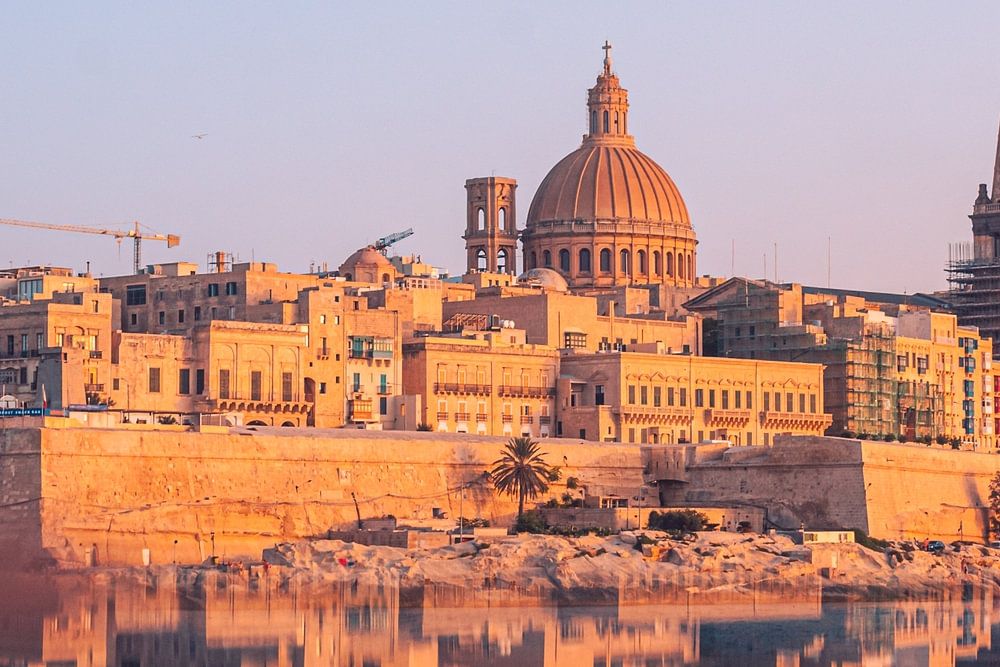 Perfecte reflectie van het stadsgezicht van de oude stad Valletta op het eiland Malta. In beeld de St. Paul's Cathedral en Bażilika Santwarju tal-Madonna tal-Karmnu.