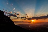 Zonsondergang vanaf de Sir Lowry's Pass met Valsbaai en de zon prcies boven de Tafelberg