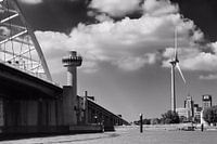 Deel van de Van Brienenoordbrug met windmolen op de achtergrond in zwartwit