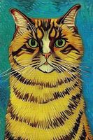 De kat is geportretteerd in de stijl van Van Gogh met het bekende streepjes patroon in de blauwe kleuren op de achtergrond.
