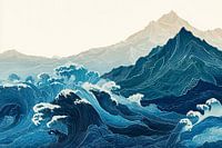 Van Golf naar Hoogte toont een zachte, vloeiende overgang van oceaan naar berg. Langs een verticale as veranderen gestileerde golven geleidelijk in abstracte bergcontouren. Beweging gaat over in stabiliteit, ritme in stilte, zonder harde scheiding tussen de elementen.