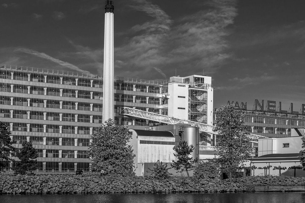 De Van Nellefabriek in Rotterdam, vastgelegd in een strakke zwart-wit compositie vanaf de waterkant. Deze voormalige tabaks- en koffiebranderij uit de jaren 30 is een schoolvoorbeeld van het Nieuwe Bouwen en staat sinds 2014 op de UNESCO Werelderfgoedlijst. De industriële lijnen, de reflectie in het water en de dramatische lucht geven het beeld een krachtige, bijna grafische uitstraling. Perfect voor liefhebbers van architectuur, Rotterdam of tijdloze fotografie.