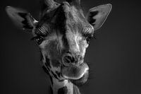 Portret van een giraf van onderen in zwart wit