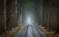 Misterieus landweggetje omgeven door mist.