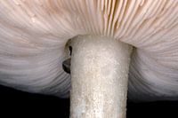 Dit is de onderkant van een plaatjeszwam. Een plaatjeszwam heet zo, omdat de onderkant van de hoed uit plaatjes bestaat, waaruit de sporen komen. Die plaatjes kun je hier zien als lamellen. Normaal zie je die niet, omdat we van boven op de paddenstoel kijken. Achter de stam zit nog iets wat lijkt op een slakje. Dat heb ik gewoon laten zitten.