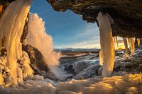 Tijdens de zonsondergang wist ik mezelf met enige moeite achter het ijs van de IJslandse waterval Gluggafoss te begeven. Het gouden zonlicht gaf een warme tint aan de ijspegels.