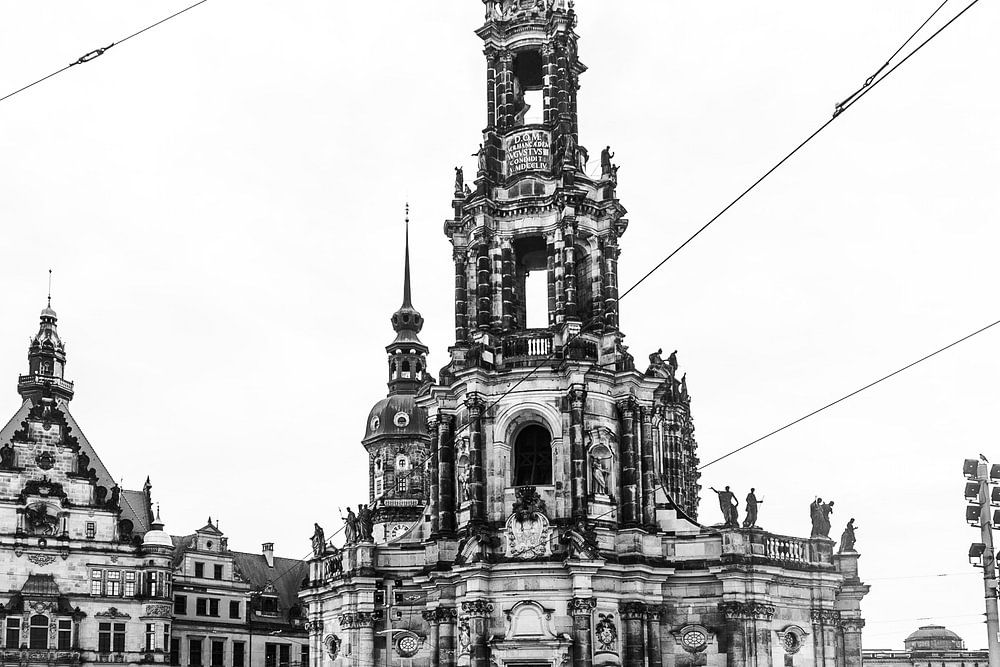 Vanaf de augustusbrug in Dresden blik op Hofkerk met de lijnen van de tram en de kabels